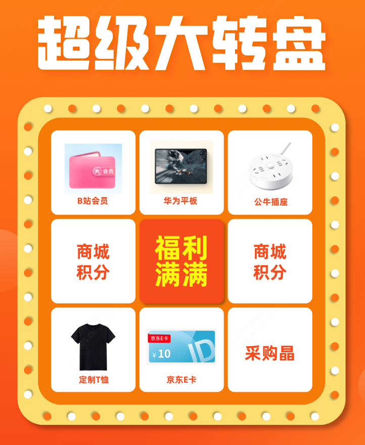 这个月,我们的超级大转盘福利再升级!9月5日当天下单,即可免费解锁抽奖机会,华为平板电脑、bilibili会员卡、京东E卡、公牛插座、定制T恤、采购晶等你来拿!新学期换新平板,追剧学习更带劲!