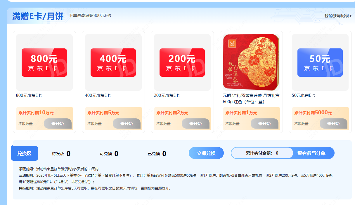 此外,本月超级会员日满赠福利再次加码:除满5000送50E卡外,下单累计满1万将赠送元朗锦礼·双黄白莲蓉月饼礼盒,满2万赠送200元E卡、满5万赠送400元E卡、满10万赠送800元E卡!(以E卡形式发放,非积分形式)