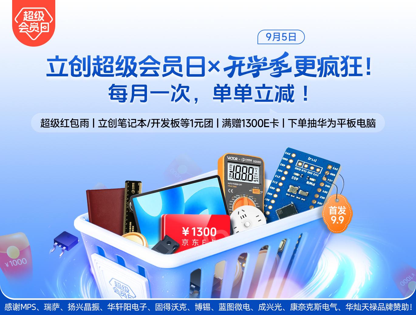 同学们,开学啦!准备好迎接新的学习挑战了吗?面对新的学习与研发、实验需求,立创商城9月开学季超级会员日重磅来袭,让你的科研准备更省心!搞研发、做实验统统不用愁。这一次,红包雨、大转盘、满赠礼全在线,更有刚需品1元购、新品直降,九月就等这一天!