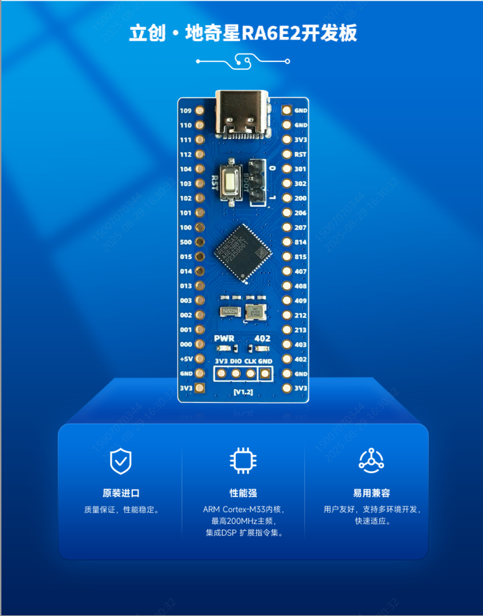 本次超级会员日首发的立创·地奇星,使用瑞萨R7FA6E2BB3CNE主控,搭载Cortex-M33内核,Code flash 256KB、Data flash 4KB、SRAM 40KB,最高200MHz主频,可以提供高效的计算能力。支持 E2-lite、J-Link等方式调试;支持E2 studio、KEIL5等软件开发;多种通信接口如UART、SPI、I2C、13C、CAN、FD等,以及广泛的GPIO引脚。