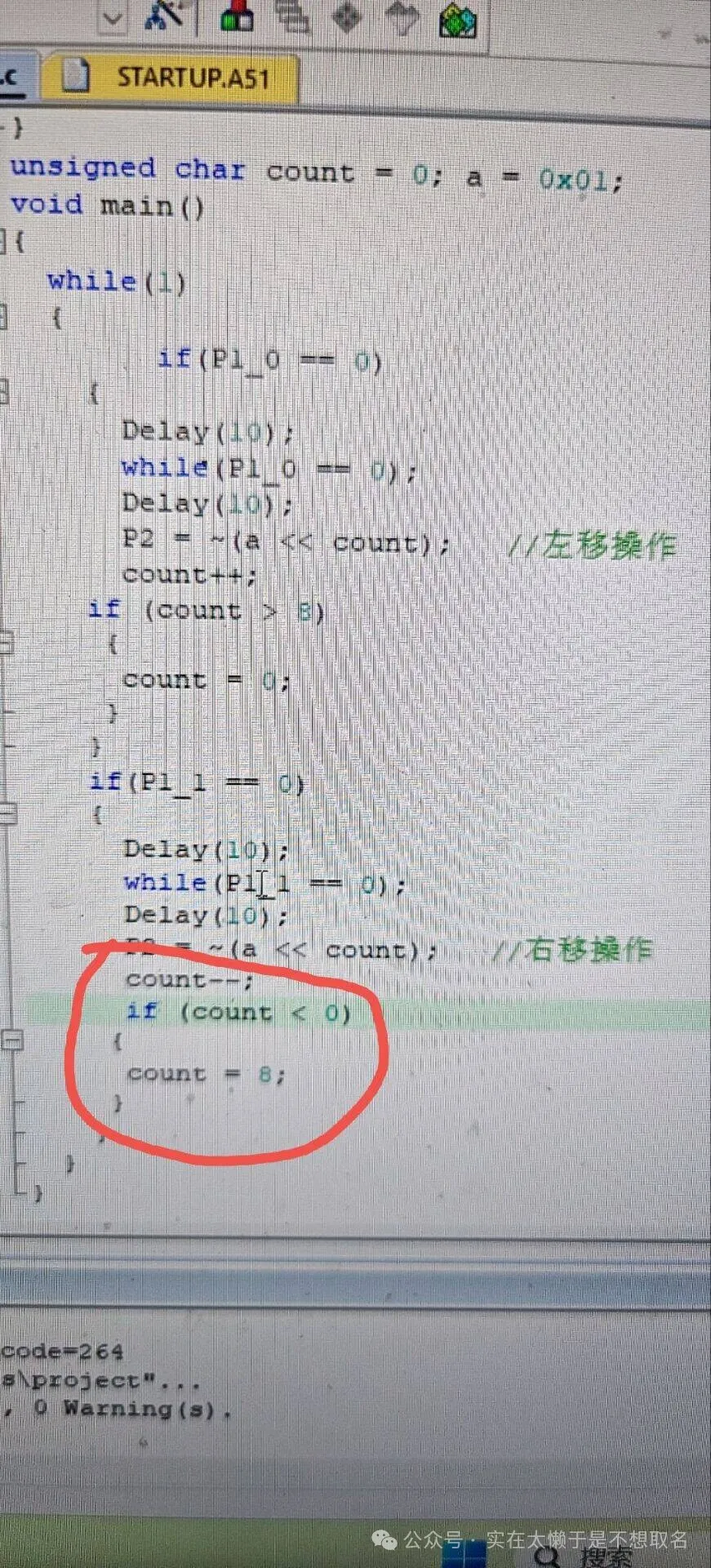 于是上述视频的问题在于它定义的无符号数count,代码其他并没有什么问题,最大的问题在于其修饰符号unsigned,这样子count为0时再减一可不是-1,而是255也就是0xFF,即便是代码其他都没有错误,也无法达到效果甚至有时候起到反作用。