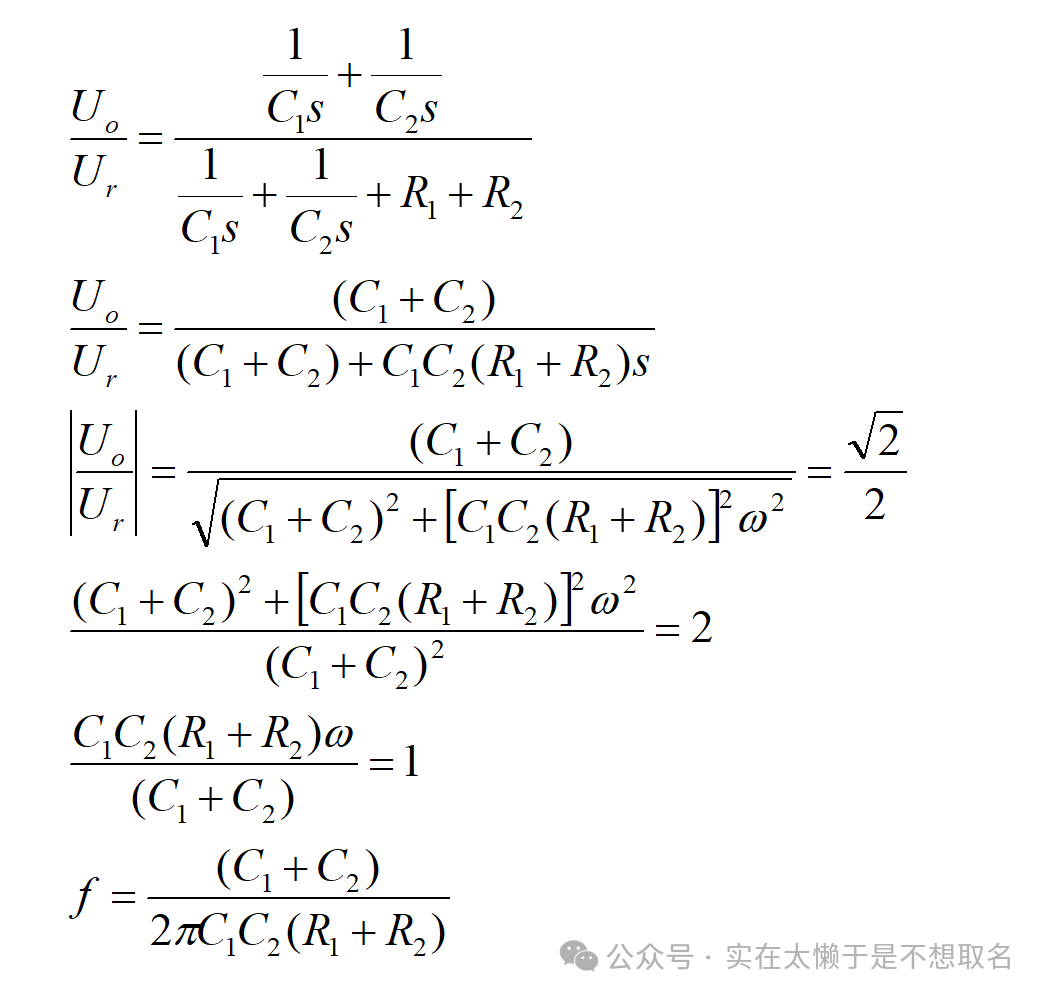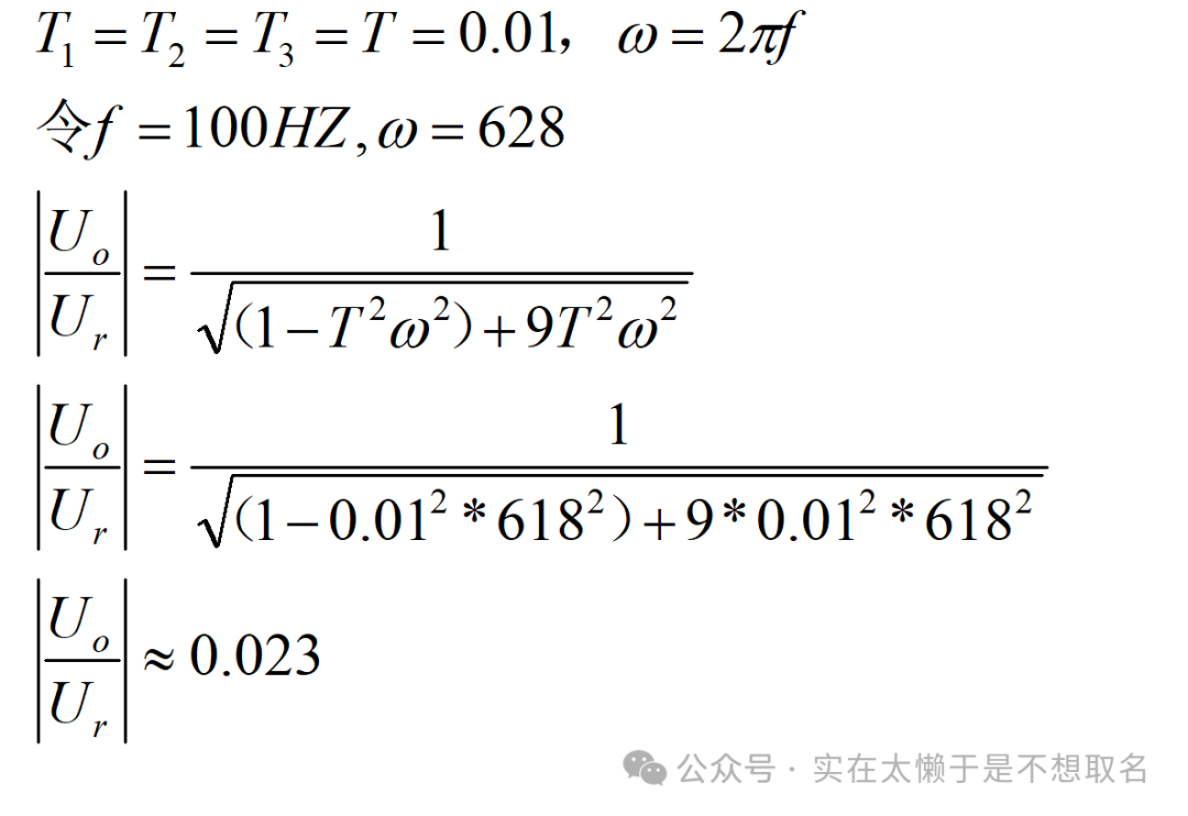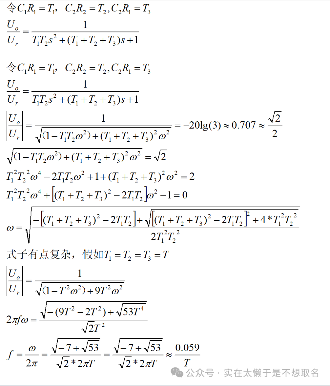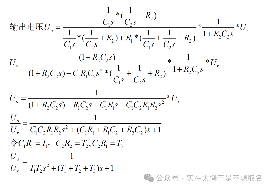 这样子我们就可以获得二阶无源滤波器的传递函数了,这里也可以看出来为什么这个是二阶系统,由于传递函数中,分母的最高阶数为2,于是这是一个二阶系统。