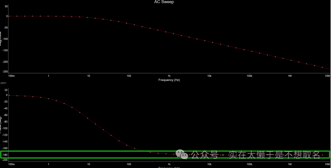 根据我们的计算,截止频率f = 5.9,相角趋于-180,我们使用Multisim的AC Sweep扫频获得Bode图即 幅度频率特性曲线和相位频率特性曲线 。