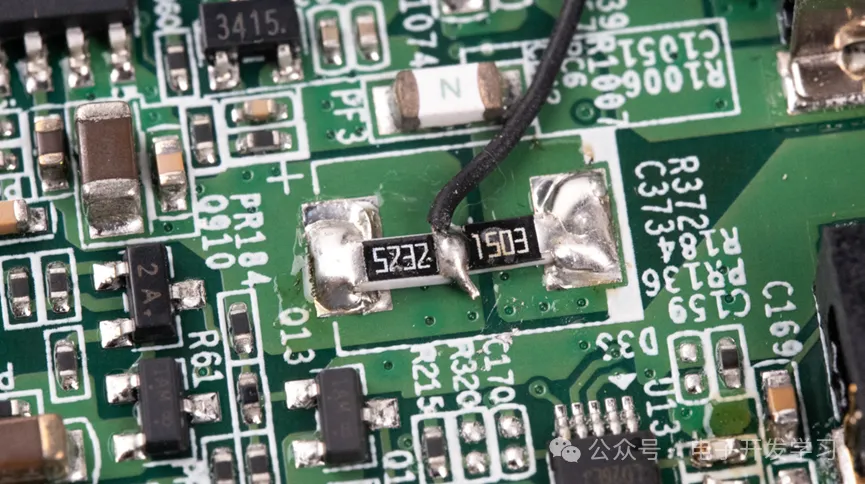 飞线的一端看起来是一个电感或者二极管或者钽电容的位置,焊接了两个1206的电阻分压,然后从分压点引出飞线。
