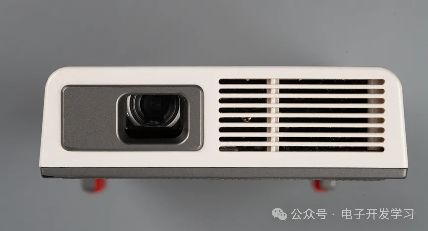 正面投影仪出光居左放置,右边是一些散热格栅。