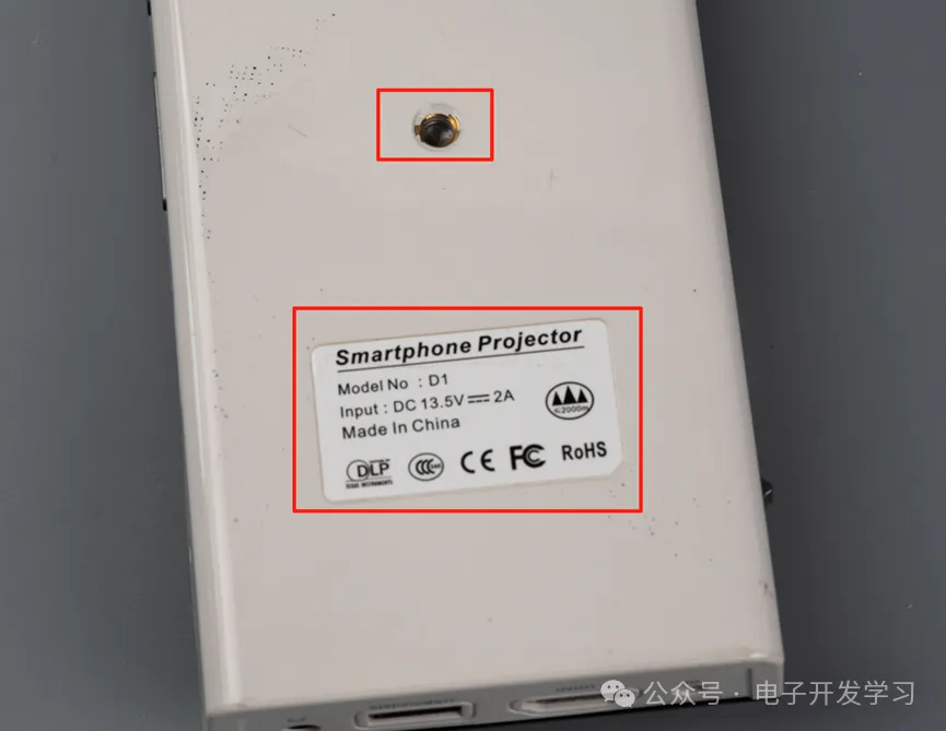 底部有四分之一螺丝口。铭牌上写着Smartphone Projector D1,关于这个投影仪,我网上查找资料愣是没找到,只在闲鱼看到一个全新未拆分的售价是999元。