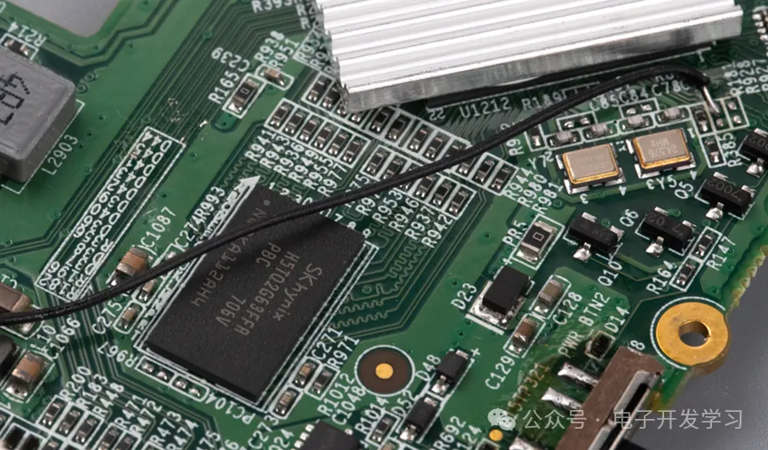 CPU旁边有颗H5TQ2G63FFR-PBC,这是一颗来自海力士的容量2Gb的DDR3颗粒。