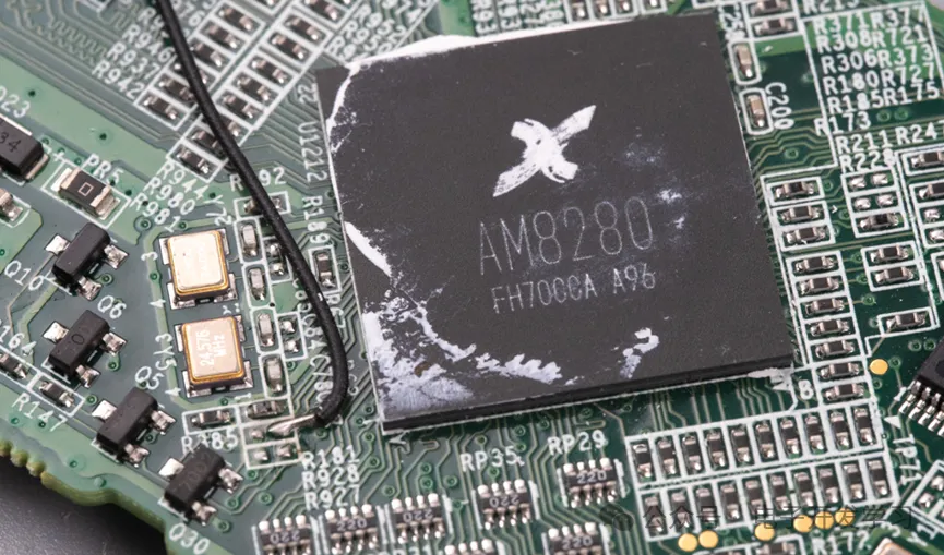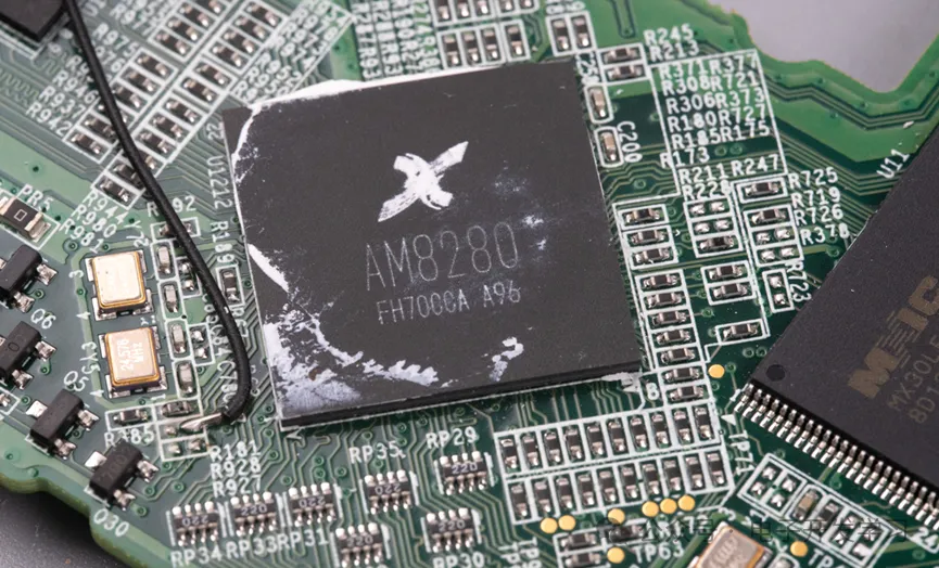 散热片拿掉,CPU型号是AM8280,来自炬力的一款芯片,具体性能指标不详。