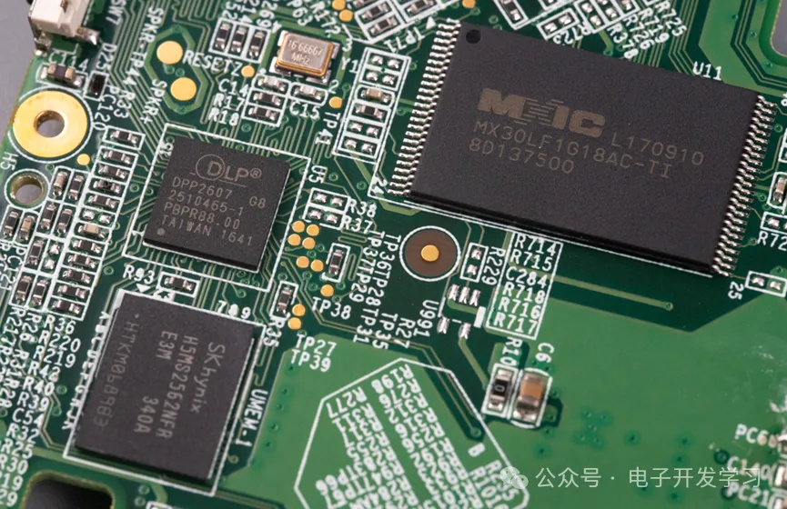 DLP显示控制芯片用的是Ti的DPP2607。DLP芯片旁边有一颗来自海力士的H5MS2562NFR-E3M内存颗粒,容量256Mb,看起来这个内存颗粒是配给DLP芯片的。板子上有一颗来自MXIC的NAND Flash芯片,型号是MX30LF1G18AC-TI,容量为1Gb。
