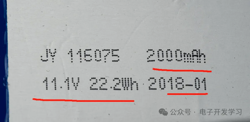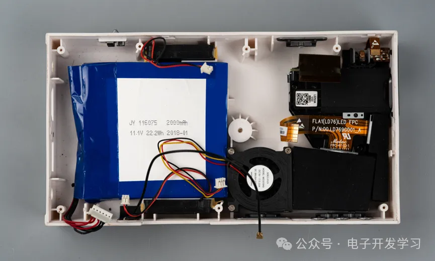 电池包上的参数,11.1V的电压,2000mAh容量,日期2018年1月,估计这也是这个投影仪的生产时间。