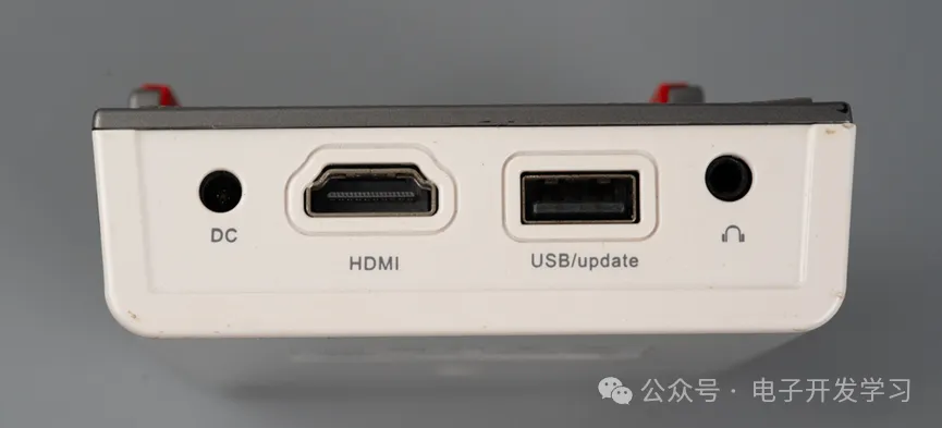 尾部有DC供电口、HDMI输入口、USB口以及耳机接口。