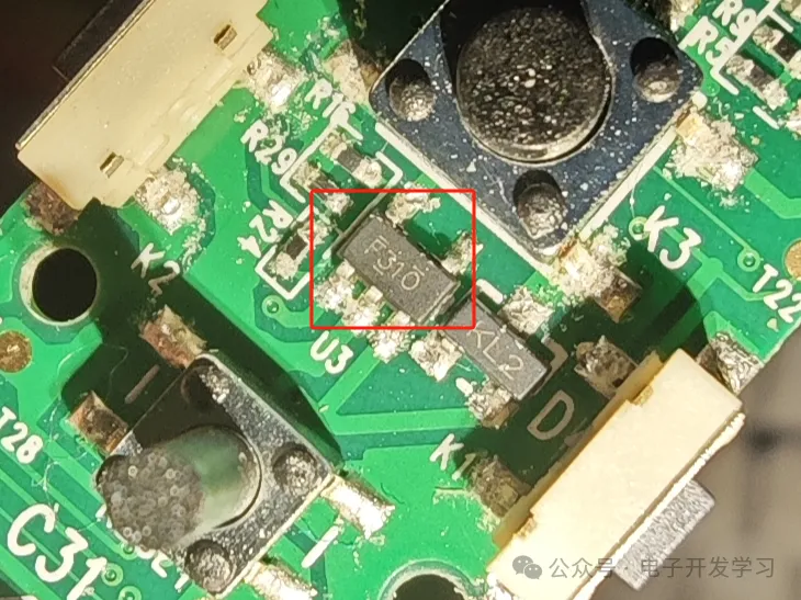 使用的LDO是SOT23-5封装的,输出实际测量是3.3V,给MCU和其他芯片供电(喇叭功放是通过vbat经过mos之后直接供电,未降压)。具体型号根据F31O这个丝印没有查找到。