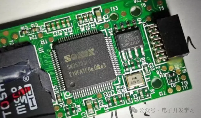 首先映入眼帘的就是这颗LQFP-80封装的器件,型号是SN95303FG,这是松翰科技的具有SONIX OID3解码器的16位 DSP处理器。运行主频为48MHz,外部晶振为3225封装的4脚晶振,频率为12MHz。不过看布局和走线,这个晶振的起振电容摆放得不是很好,晶振走线还打孔到背面然后走了一段又绕到正面进入MCU管脚。回到MCU本身,这个MCU内置64KW ROM、16KW RAM、16KW Working RAM。可以支持运行外部SPI Flash或者SD/MMC内的代码。为啥这个单位不是KB而是KW,应该是因为这是16位处理器,所以W是Word的意思。