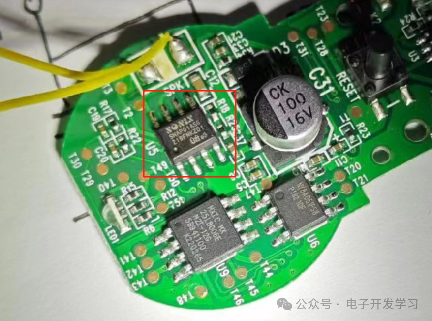 驱动8Ω0.5W喇叭的功放芯片是松翰的SNAP01ASG,这是一个AB类音频功放。2.4V-5.5V供电。封装形式为SOP-8。