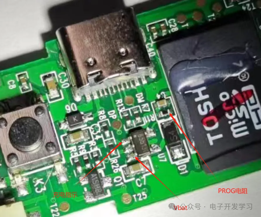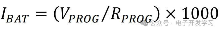 点读笔上的这个1脚并未直接接一个LED指示灯,而是通过一个外部电路之后接入到MCU引脚了。这样做的目的是,在充电的时候,由于有外部供电的存在,所以此时MCU可以工作在运行状态,这样就可以通过这个引脚监控充电状态,在充电过程中控制jojo头顶的彩灯闪烁红色,来指示充电中,然后充满电了可以控制这个RGB灯绿色常亮。如果充电芯片的CHRG引脚直接接LED,那只能显示一种颜色,也就只能通过闪烁或者常亮或者常灭来指示状态,不够直观。这个芯片可以通过5脚PROG的电阻大小来设置恒流充电的电流大小。其电流由下面的公式决定: