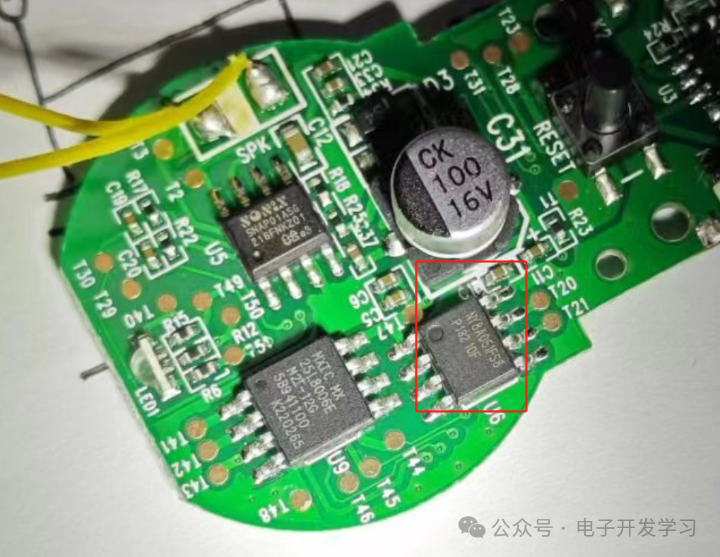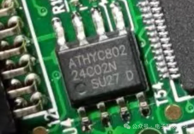 在MCU旁边的SOP-8封装的器件是24C02C,看名字就知道这是EEPROM,但是我确实没找到这个是哪个公司的产品,这个EEPROM的容量是2Kb,某宝上找到的价格大概是0.13元左右。