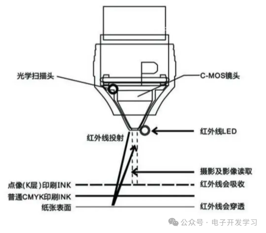 既然要识别这些小点的排布,那么大概率会用到图像识别传感器,也就是摄像头。在识别的过程中,摄像头怼在书上,没有光线进入摄像头可不行,所以要有发光器件,但是在识别的时候没有看到有发光的现象,所以可能是红外光。