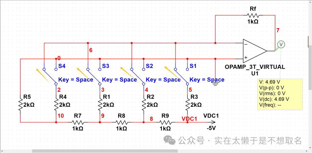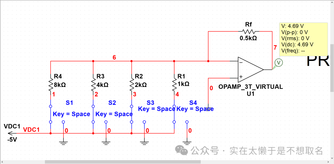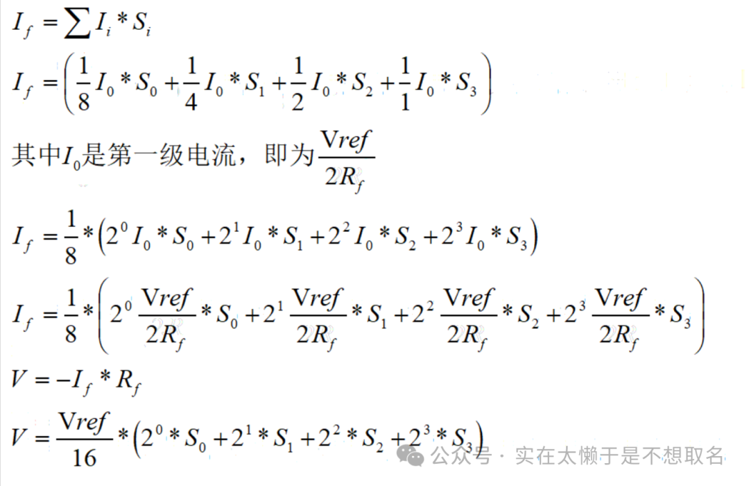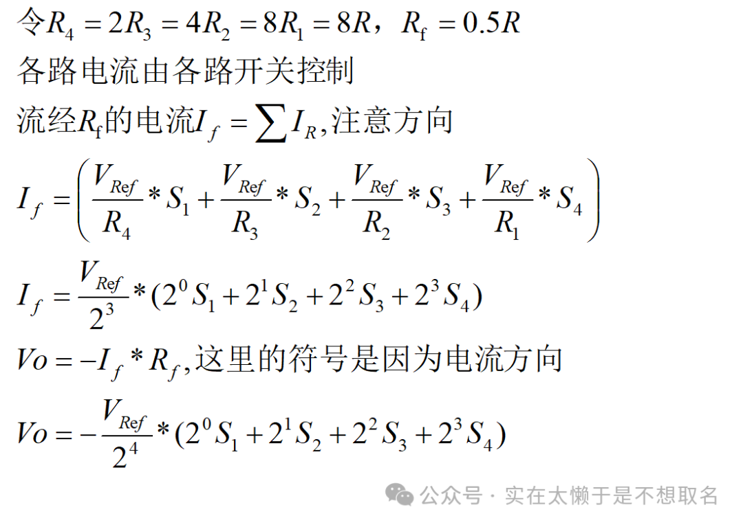 这是一个 经典权电阻网络DAC 结构。由于虚短特性,放大器的反向输入端的电压约为0V,我们分析各路电流。