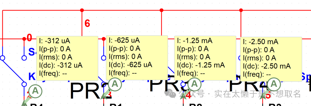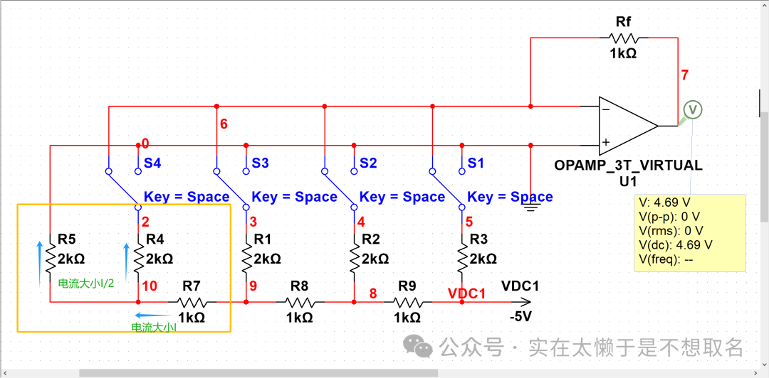 可以看到,每一级的电流大小都是上一级的一半,由于同相输入端和反相输入端的虚短,因此可以认为导通到地。