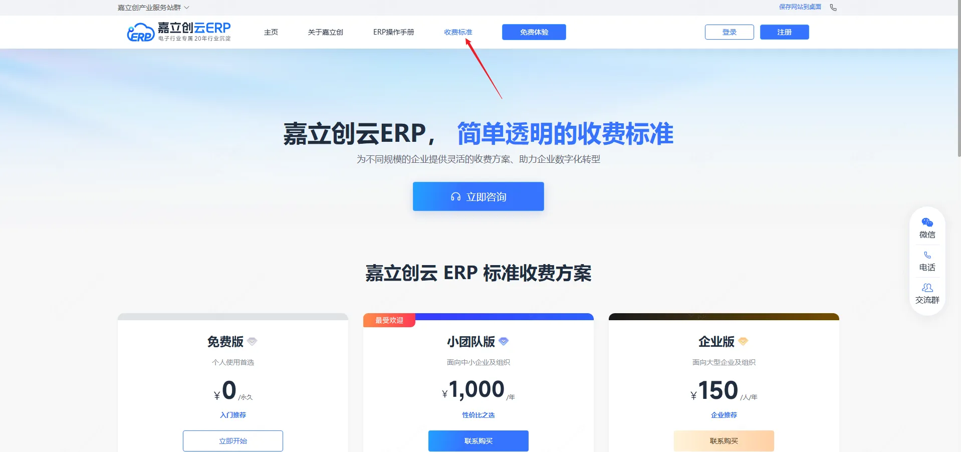 1. 官网增加收费标准tab页面,可查看嘉立创云ERP标准收费方案
