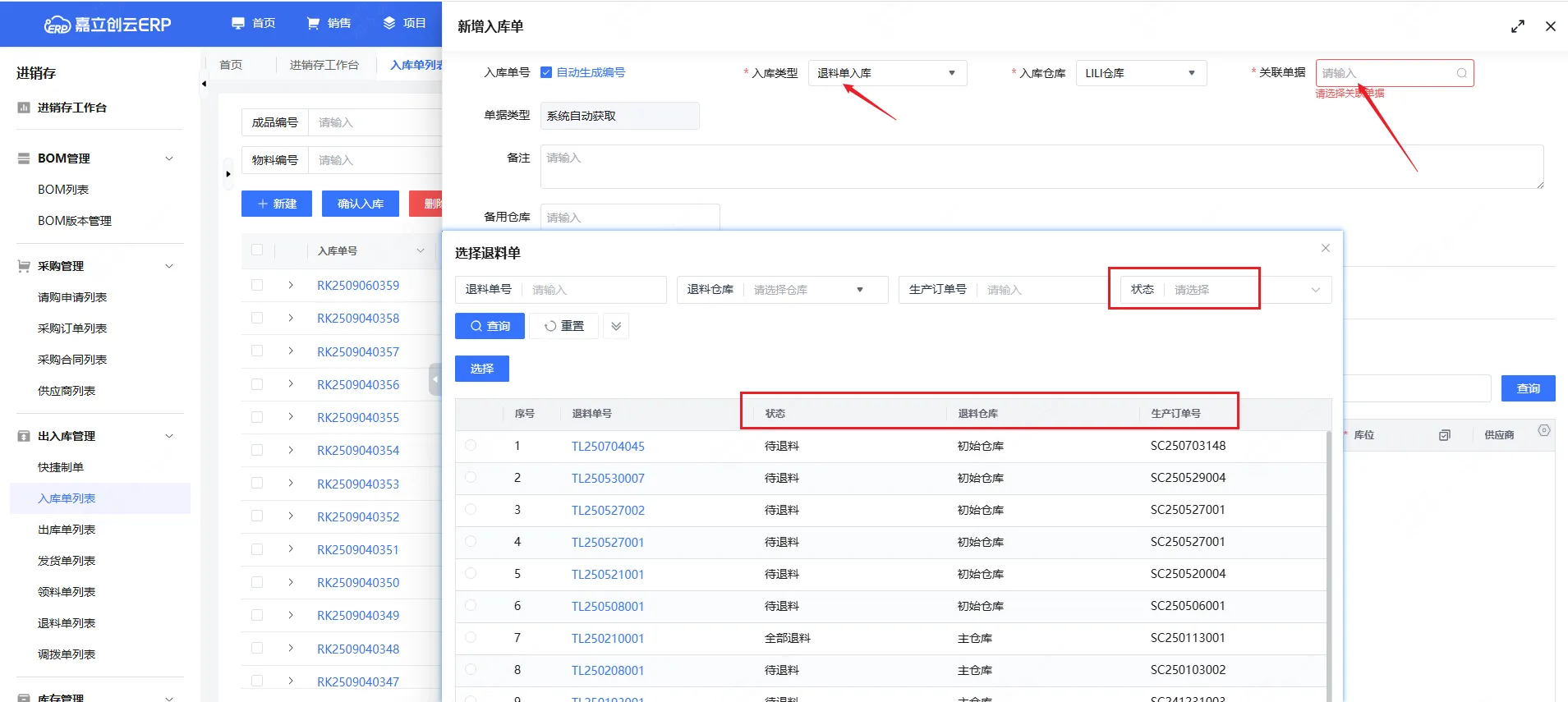 2,【入库单】选择退料单入库,点击关联单据,列表新增字段展示:状态,新增查询条件:退料单号、退料仓库、生产订单号、状态。