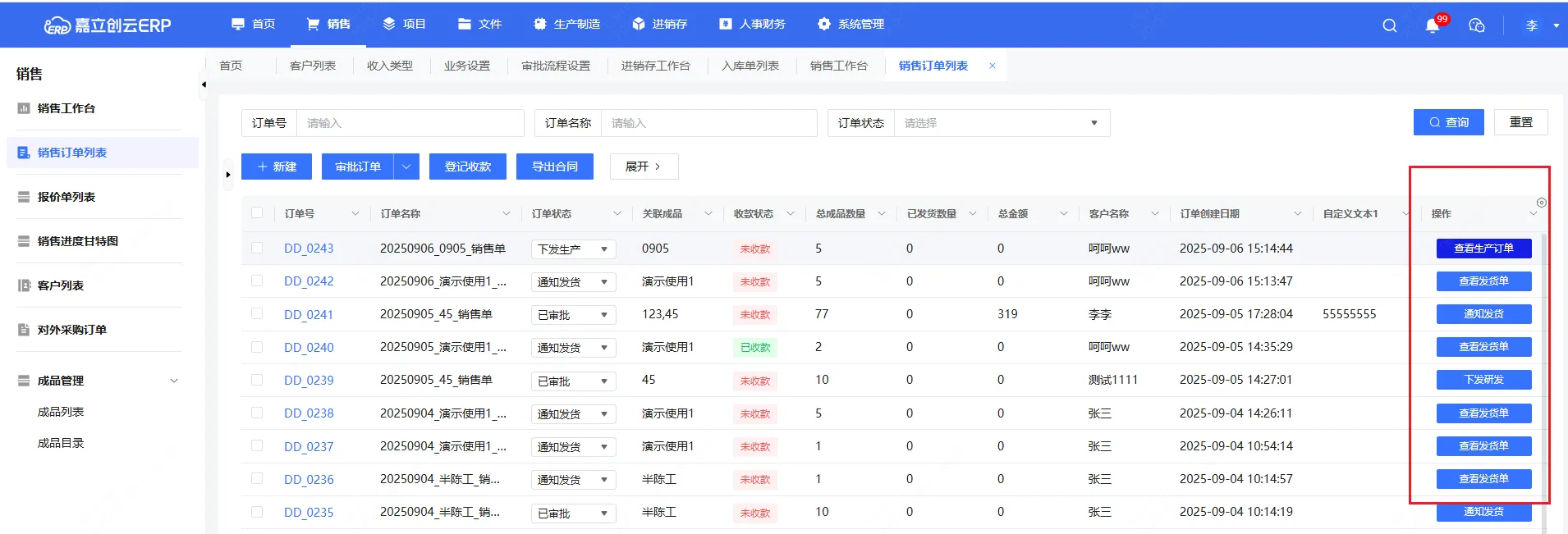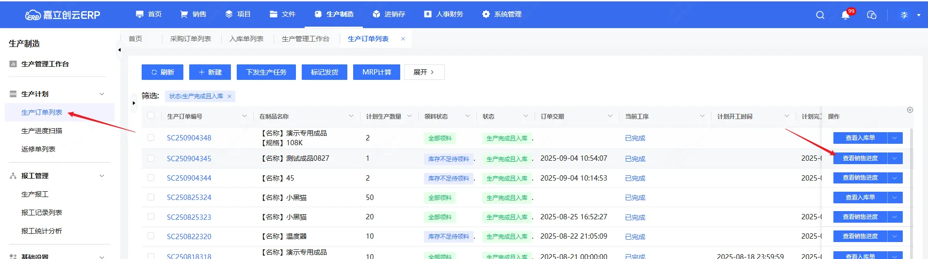 2,生产订单列表菜单,生产订单有关联销售订单情况先,按钮调整为“查看销售进度”