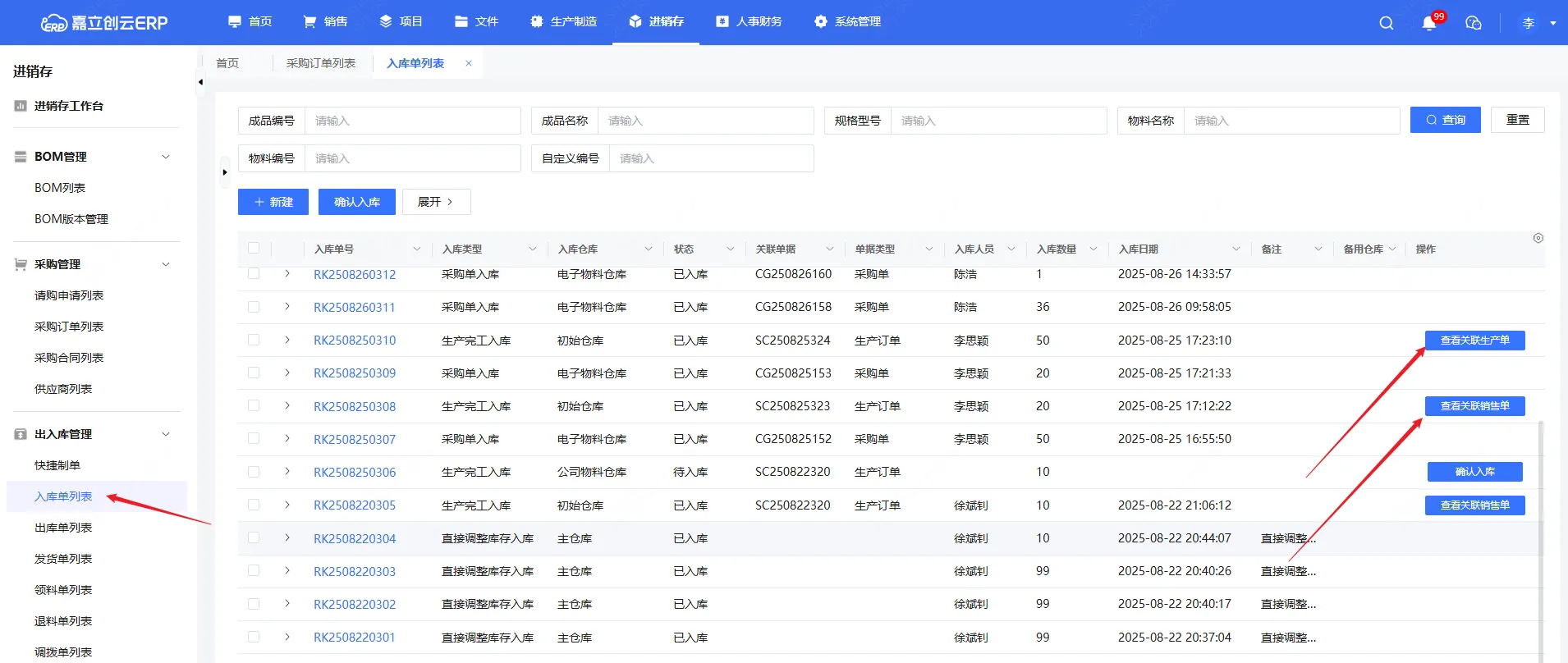 1,入库单到货入库后,增加“查看关联生产单”/“查看关联销售单”操作按钮