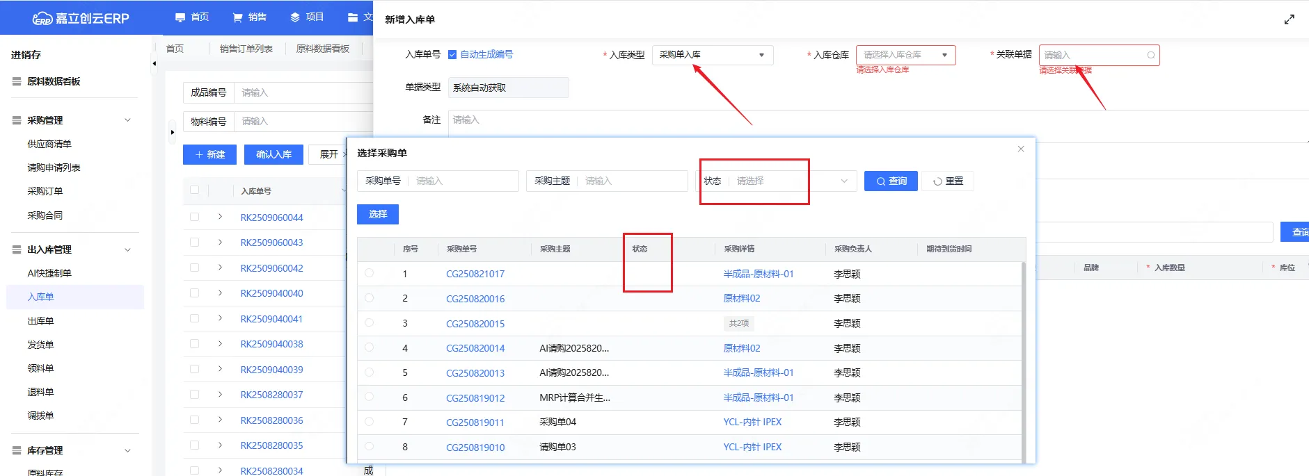 1,【入库单】选择采购单入库,关联单据弹窗,增加状态筛选与字段显示