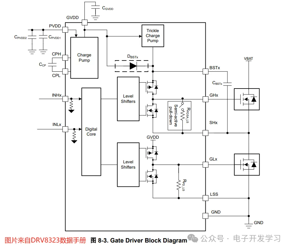 作为电控最关键的就是驱动电机转动,电瓶车的无刷电机有三个相线,每个相线需要两个MOS构成一个桥臂来驱动,下桥臂一般是NMOS,上桥臂可以是PMOS也可以是NMOS,但是对于同样电流电压导通阻抗等参数的PMOS和NMOS来说,PMOS往往会更贵。所以如果要控制成本,大概率会选择上下桥臂都用NMOS。但是上下桥臂都是NMOS这种,上桥臂驱动略微麻烦一点,需要自举驱动。当然,现在有很多成熟的预驱芯片,像下图这种,可以很简单的完成自举驱动。但是对于一个要降低成本的方案,大概率会用分立器件来搭,反正二极管三极管电阻电容这种,和芯片相比几乎就不要钱。6个NMOS估计价格一个1.5元,总共9元,再加上一堆阻容二极管三极管下来1元,所以电机驱动这块也得10元啊。