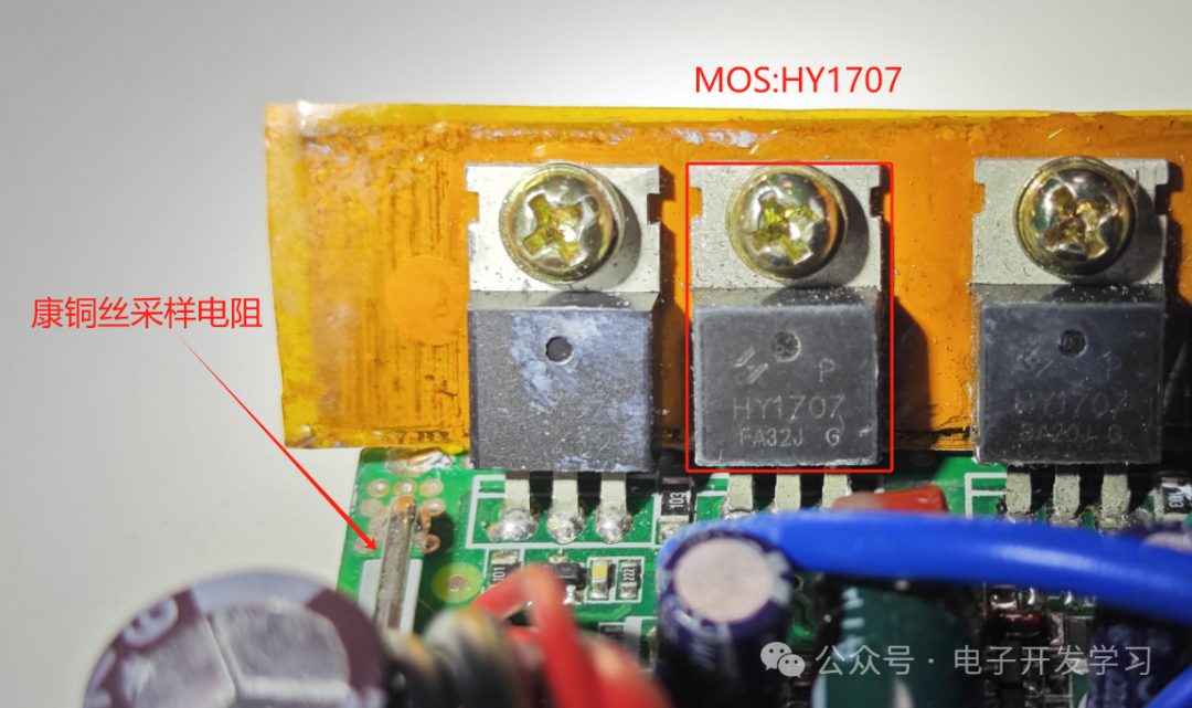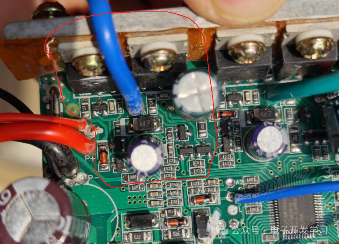 但是这个时候还不能把电路板抽出来,因为MOS散热是用螺丝固定在侧壁的,也需要拆下来,然后就可以把电路板抽出来了。