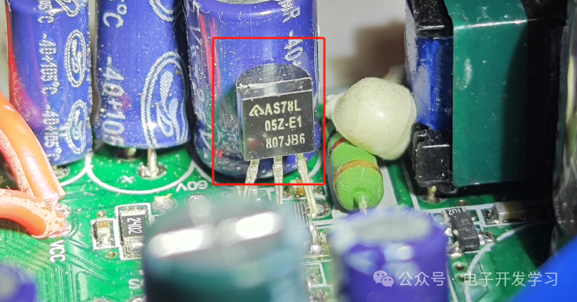 所以肯定还有一个器件是从15V转到5V或者3.3V,我在电路上找了一下,还真找到了个稳压器,型号是AS78L05Z-E1,封装也是TO92-3。