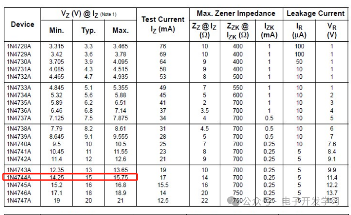 另外,用的稳压二极管是1N4744,我去查了一下这个型号的稳压二极管,Vz是15V,也就是说这个电路的输出大概是15V左右,是给MOS管驱动电路供电的。