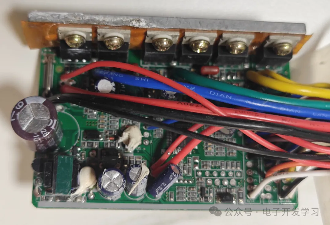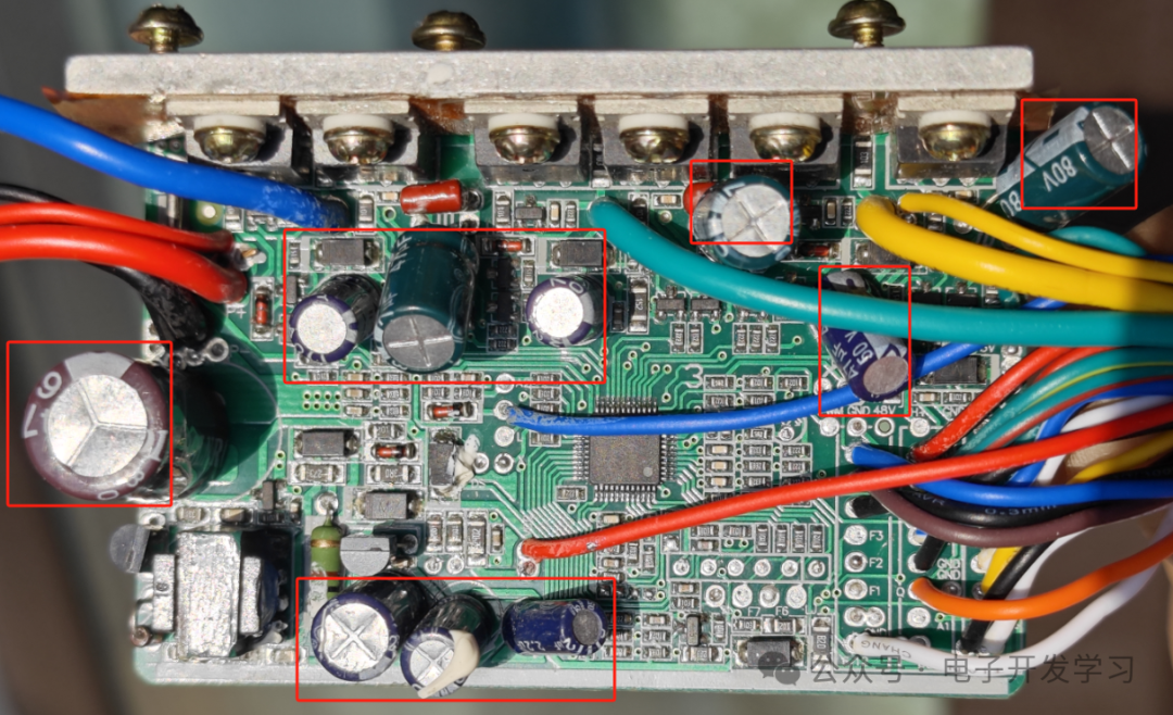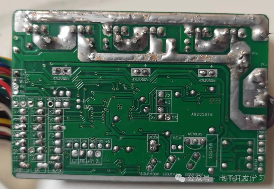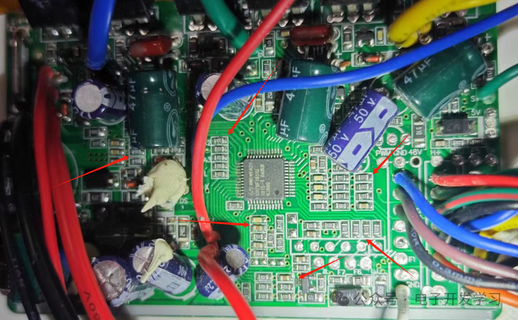 板子上有一颗470uF 63V的电解电容,是在电源输入口的,所以看来这个板子最大应该只能接48V电池吧。另外,在电机相线驱动的位置,有三个47uF 80V、三个47uF 50V共六个电解电容。在15V到5V的稳压器前后各有一个电解电容,前端的是22uf 25V,后端的是220uf 16V。另外有一个2.2uf 100V的电解电容接在某输入信号的处理电路上,这就是整个板子上的电容。