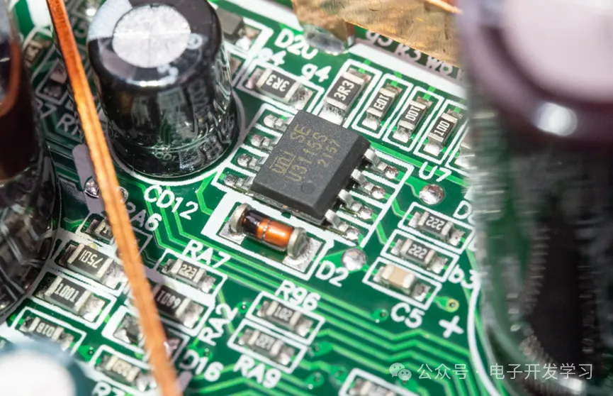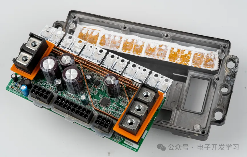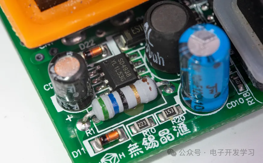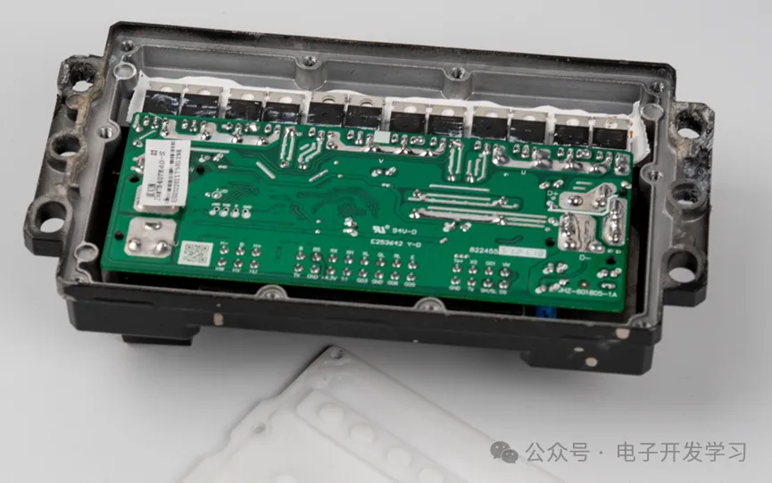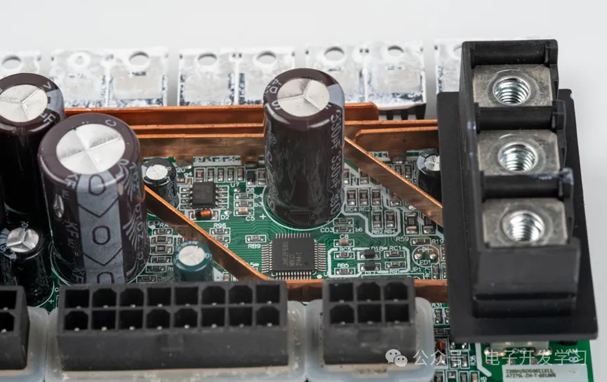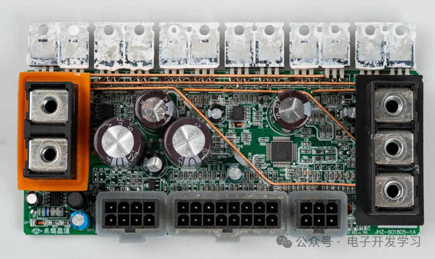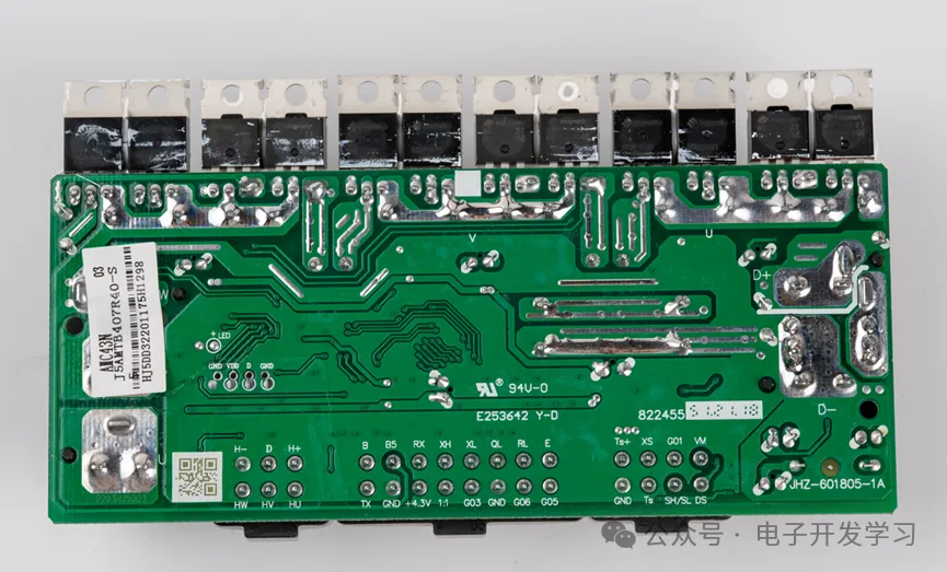 降压芯片的型号是SD4938TR,来自士兰微。这个DC-DC负责把电压从电池电压降压到12V供栅极驱动电路用,另外也通过LDO再次降压到5V给控制系统用。看到左下角无锡汇晶的丝印,可以确定之前的猜测没错了,这控制器果然是无锡汇晶给艾玛做的。