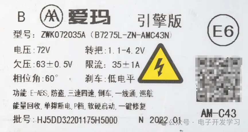 这是控制器的铭牌,型号ZWK072035A,电压72V,电流35A。看起来应该是晶汇出的。这个控制器的功能还挺丰富:E-ABS,防盗,三速四档,倒车,一线通,巡航,能量回收,单撑断电,P档,软硬启动,一键修复等功能都有。