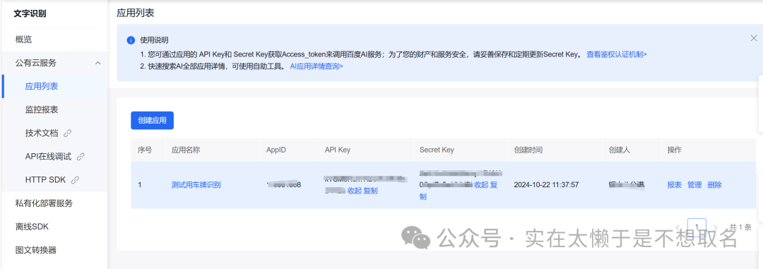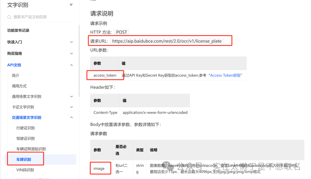 在百度智能云中找到文字识别,开通这个服务之后,申请适用额度,并且开通车牌识别的功能。之后我们阅读其API文档。