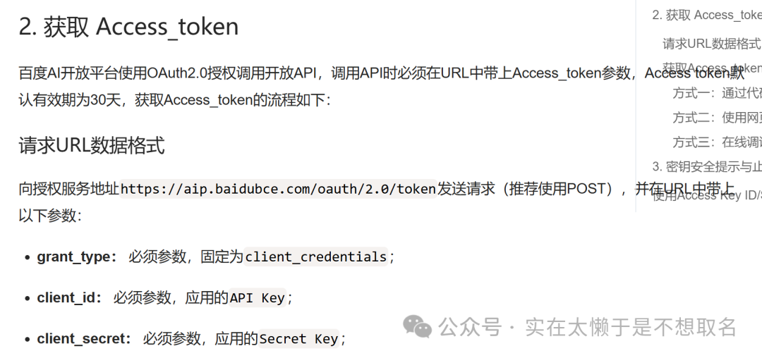 在车牌识别的文档中,我们得知,我们需要知道access_token这个参数,以及之后的图片数据,图片数据需要使用base64编码的图。前者需要我们调用一个API来获取。