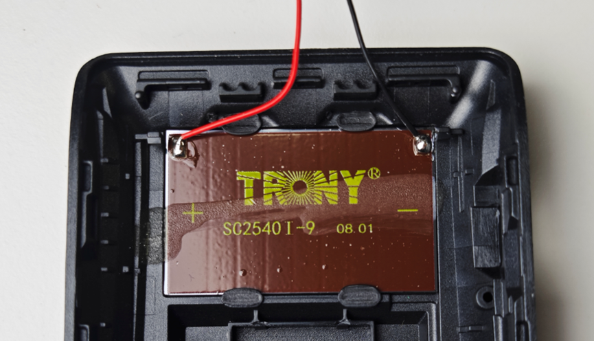 这是其背面。有一个太阳能电池板,用来为里面的蓄电池充能。另外,正常安装在车上时,这个按钮是被按下去的,一旦自行拆解或者掉了,这个按钮弹出来,这个ETC设备就会被锁定,需要带着设备去柜台解锁。底下还有一个OBU数据接口,一般用户也用不到这个口。我后来还看到有ETC终端设备,外壳上留了孔,但是里面没有焊接连接器。
