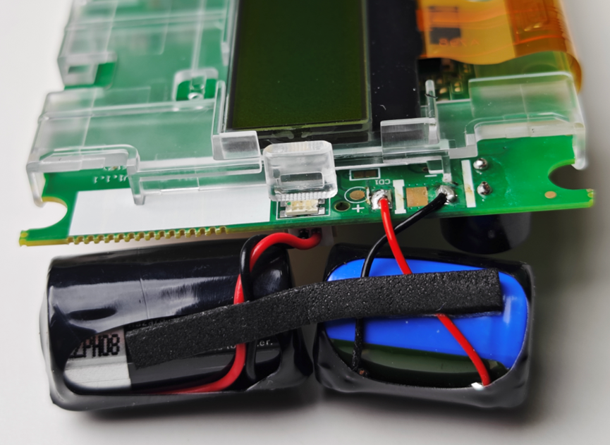 这两个电池,左边的是通过连接器插接在板子上的,右边蓝色的电池包是直接焊接在板子上的。