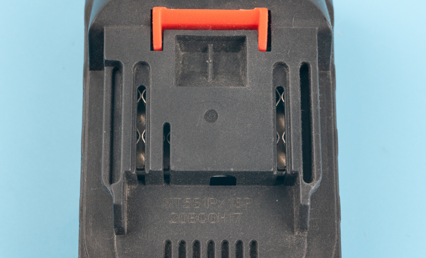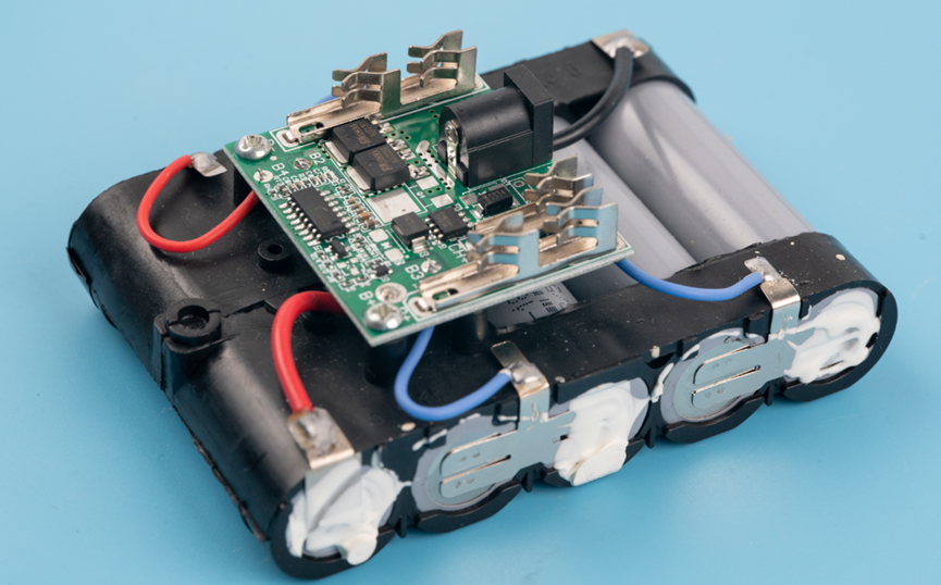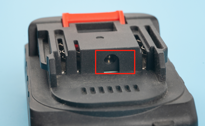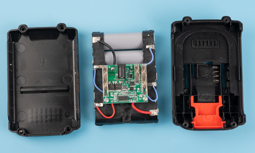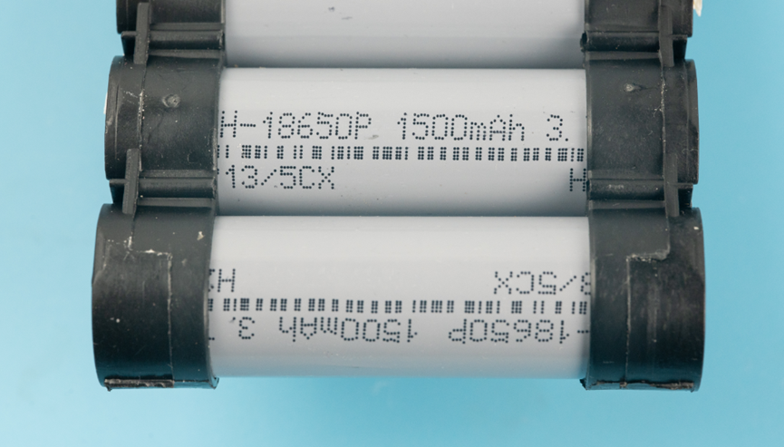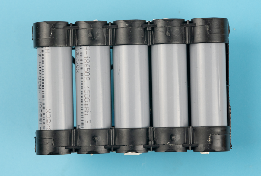 内部锂电池有塑料支架进行固定,然后使用镍片镍片点焊进行连接,5个18650锂电池串联。