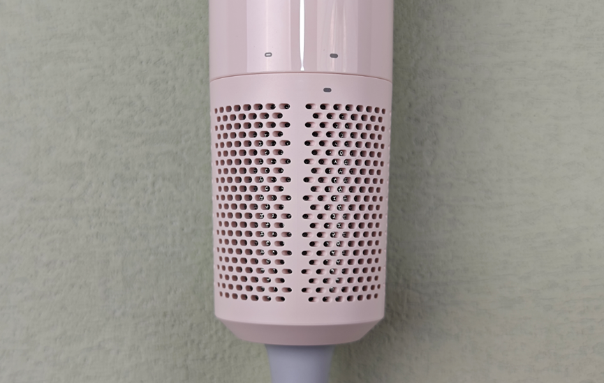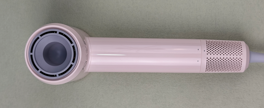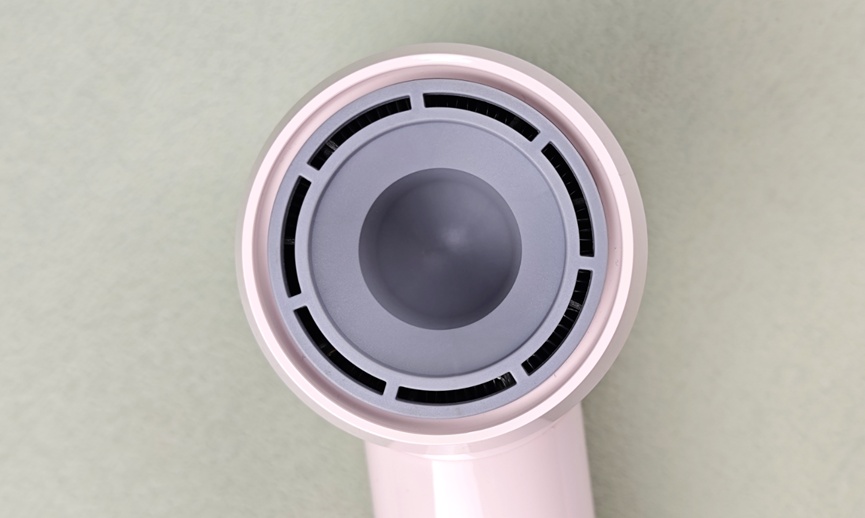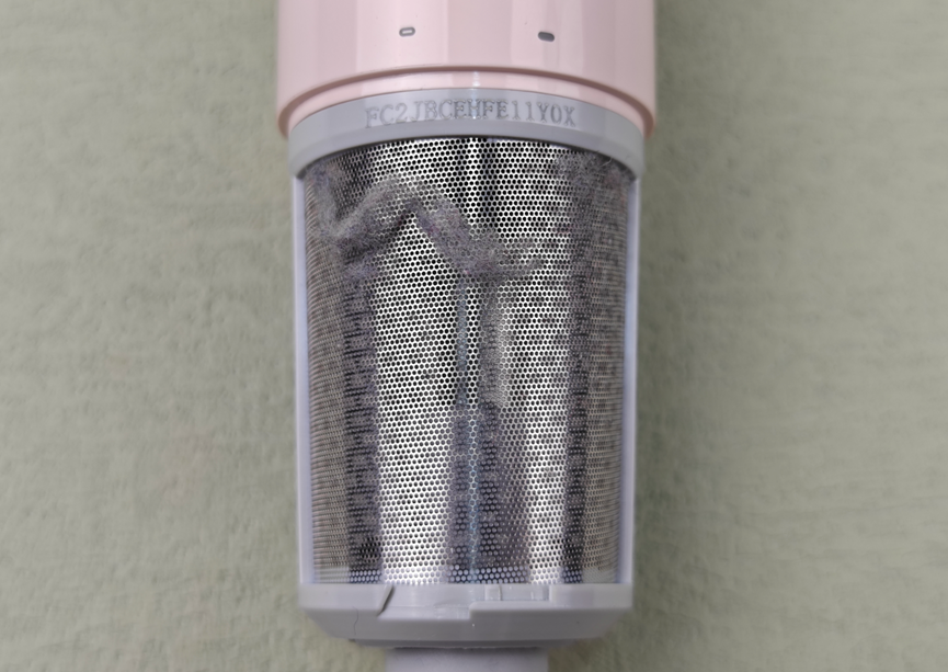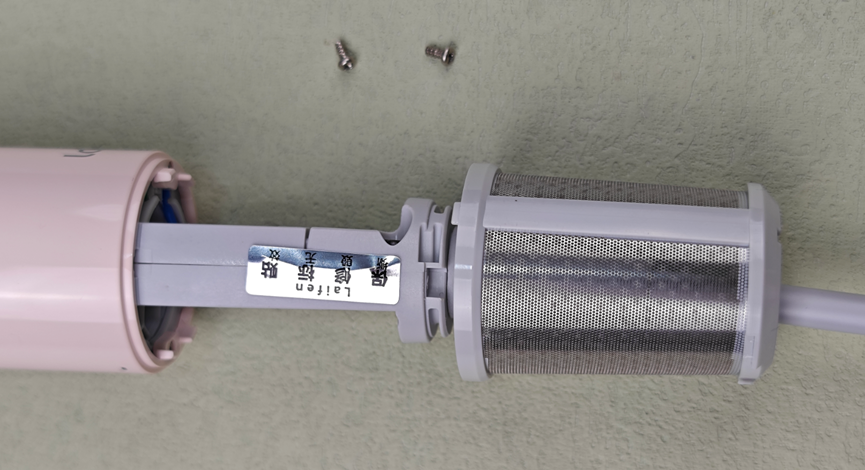 拆解的第一步是去掉外面这个塑料网罩。去掉之后可以看到还有一个金属滤网,上面好多灰尘夹杂毛絮,这是吹风机买来试用了两周期间积累的。正常可以去掉这个塑料网罩来清理。