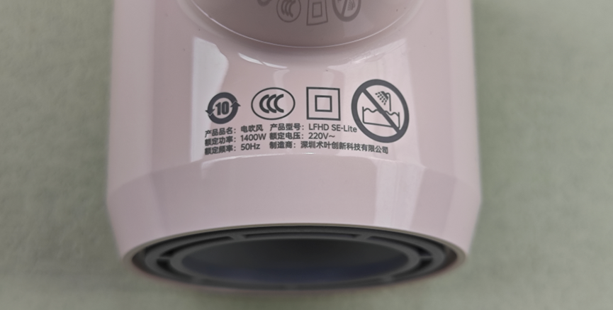铭牌,这个吹风机的型号是LFHD SE-Lite,额定功率1400W,制造商是深圳术叶创新科技有限公司。产品寿命是10年,有3C认证。