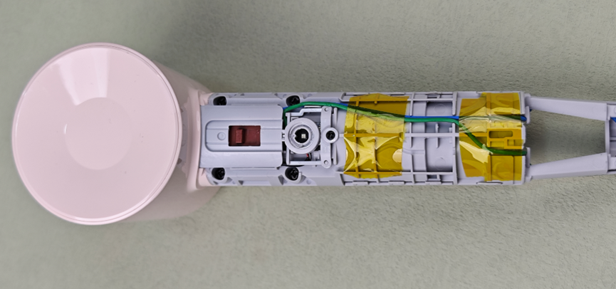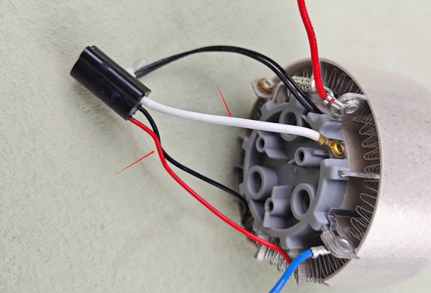 取下握手套筒之后可以看到还有几个螺丝孔。另外,导线走线的地方,有开槽,而且用耐高温胶带做了加固。