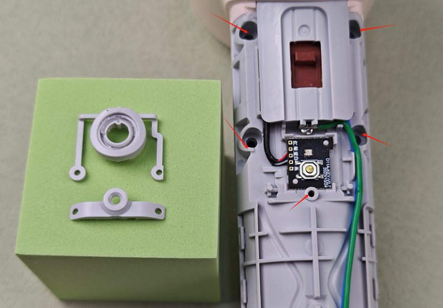 拆掉这些之后,想把手柄这个握手套筒拿下来,需要先把按键和拨段开关撬起来,这个没有合适的工具很难做到无损拆解。