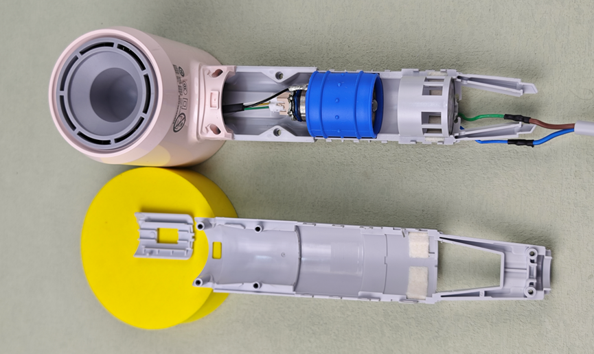 继续拆解,就能看到高速电机被蓝色的硅胶外套包裹着,安装在正常使用时握手的位置。