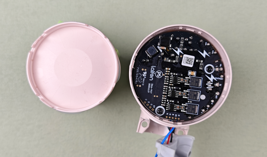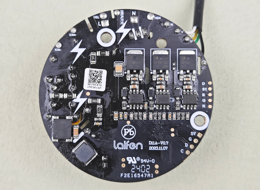 接下来,撬开后盖,就可以直接看到电路板。黑色的PCB板,用两颗螺丝固定。有元器件的位置刷了三防。