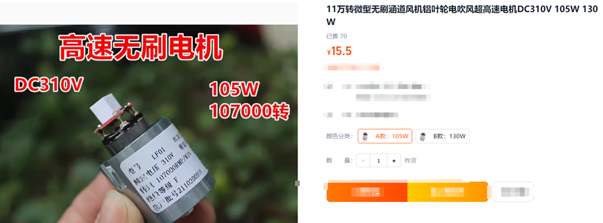 去某宝搜了一下,这款105W电机的价格是15.5元一颗。另一款130W的居然才12.5元。