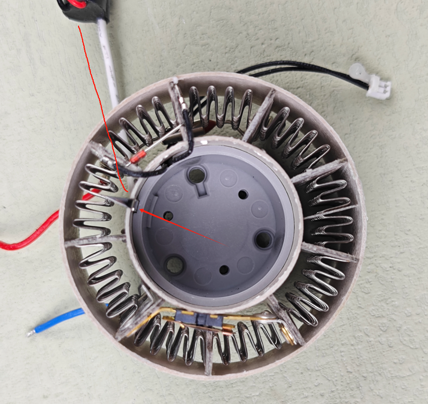 拆掉固定加热丝的螺丝,可以把整个加热丝组件拿下来。可以看到加热丝外面套了一圈云母材质的隔热圈。