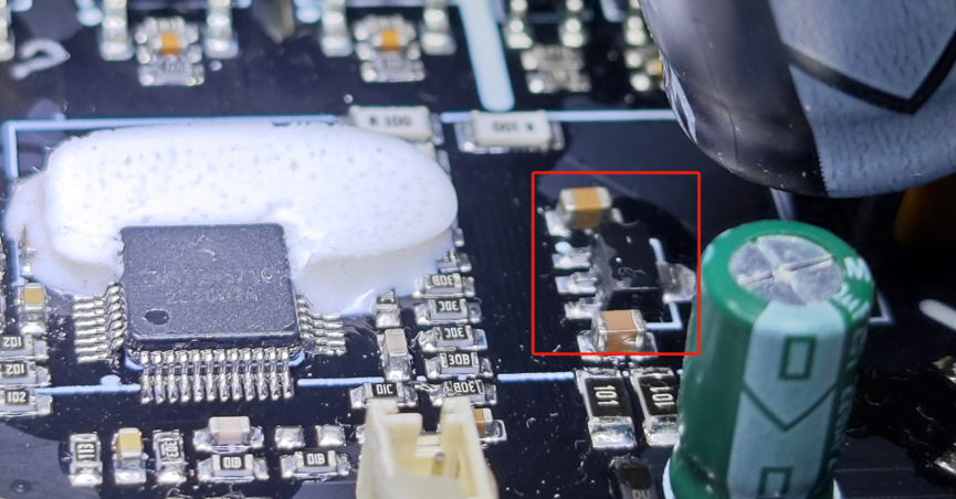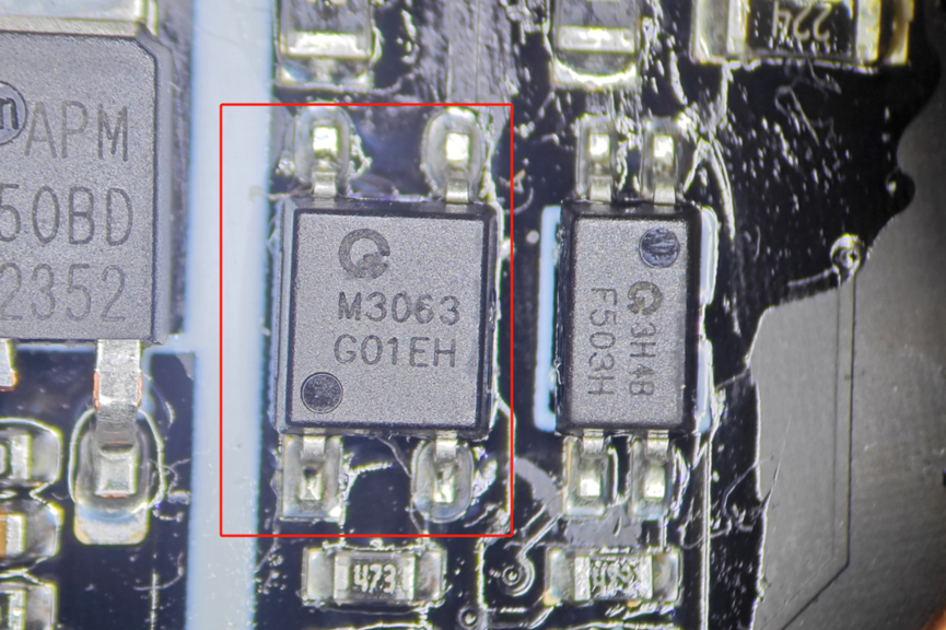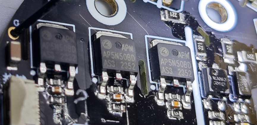 板子正面的3颗MOS和背面的3颗MOS,加上其他外围器件,组成了一个无刷电机驱动电路。MOS的型号是AP5N50BD,封装TO-252-3,来自永源微电子。这个MOS的电压是500V,电流5A,Rdson典型值为2.4Ω。