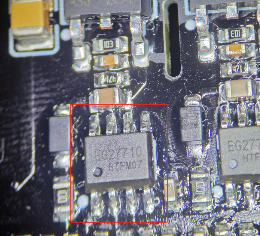 高压半桥MOS驱动芯片是EG27710,封装SOP-8,来自屹晶微,板子上总共有三颗。